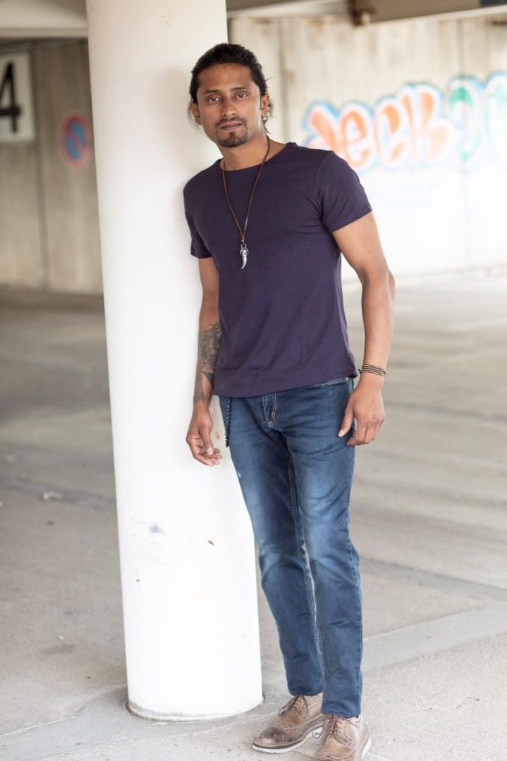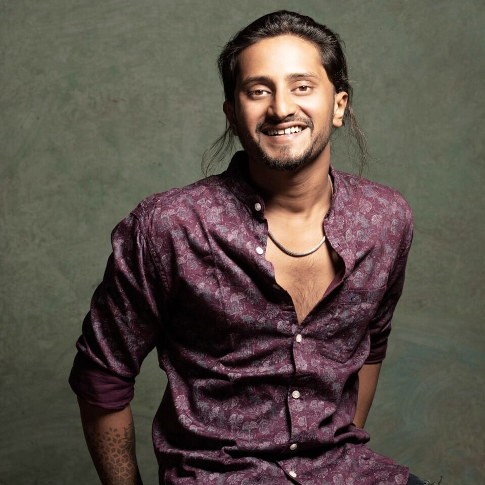 Indian, athletic build, Sharp facial features with a strong jawline, Expressive eyes, Thick, well-defined eyebrows, Dark hair with natural volume, Confident posture and presence