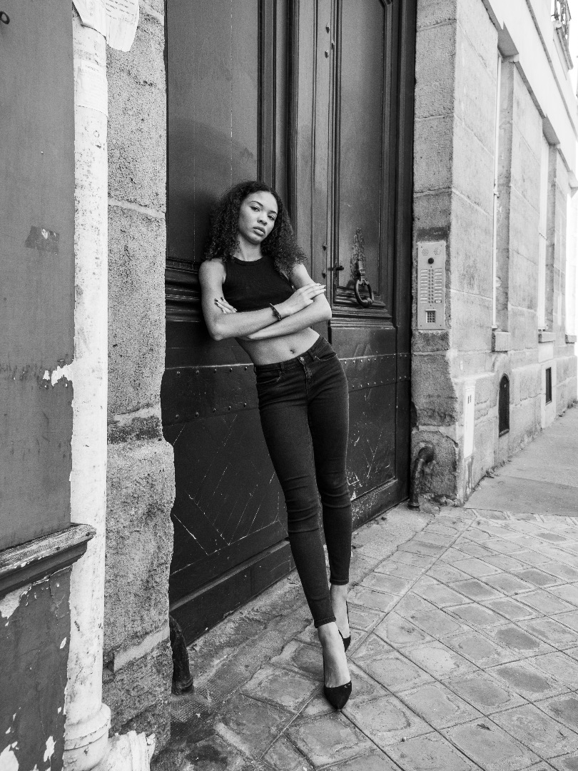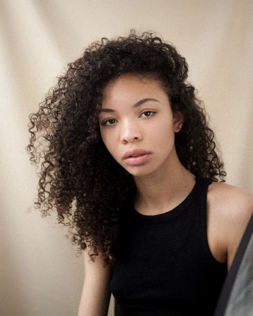 Souriante, regard expressif, cheveux naturellement bouclés, allure élégante et naturelle.