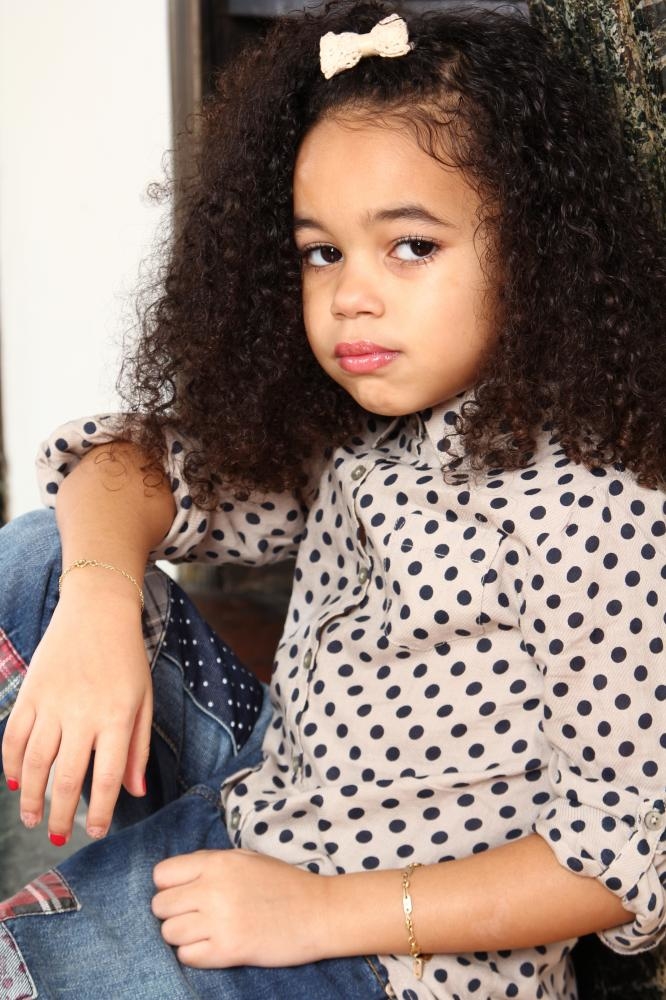 une crinière brune bouclée de jolis yeux rond et un tempérament de feu pour cette jolie petite métisse de 4 ans et demi.