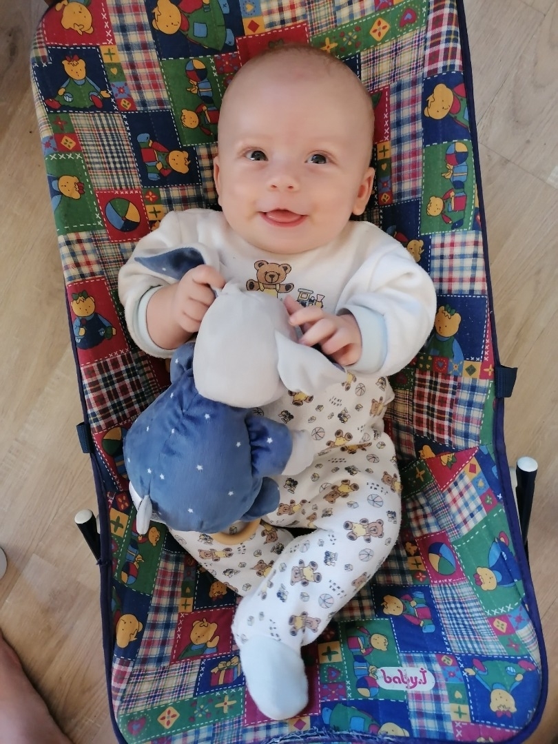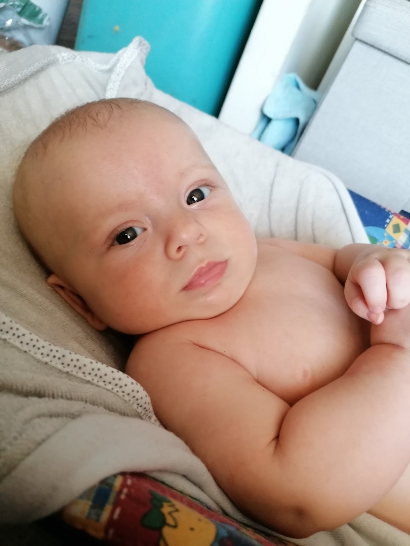 Bébé de trois mois, yeux qui n'ont pas leurs couleurs définitifs, 8kg, bébé souriant
