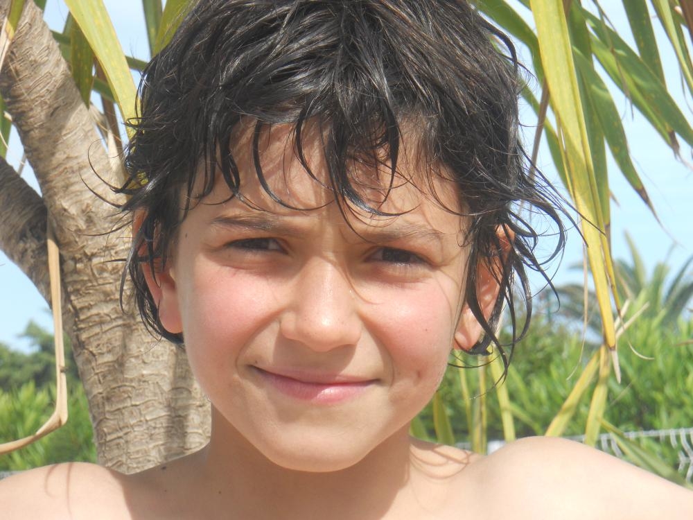 Enfant aux cheveux très bruns, et au yeux foncés, teint mate....