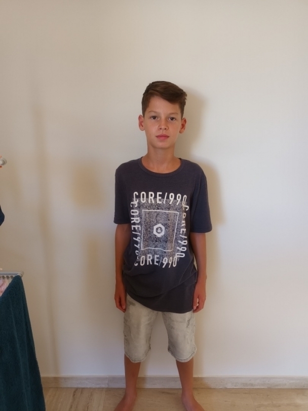 Longiligne, tâches de rousseurs visage, doigts long et fin, une fossette à droite lorsqu'il sourit,grande bouche
