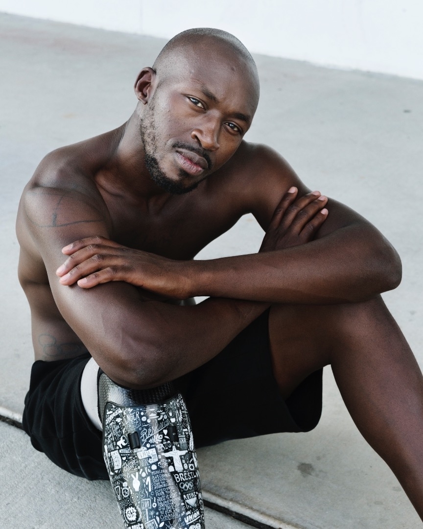 Amputee of the right leg, with tattoos and scars