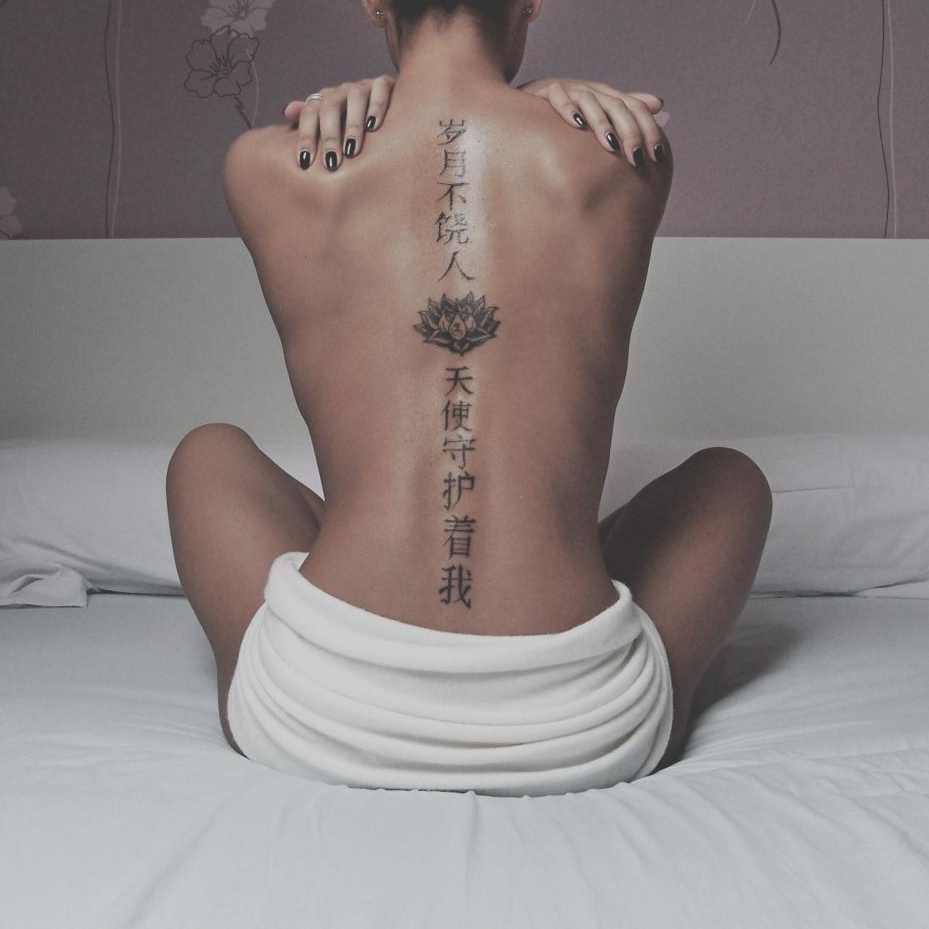 Tatouage en chinois le long de la colonne vertébrale, avec une fleur de lotus au milieu du dos