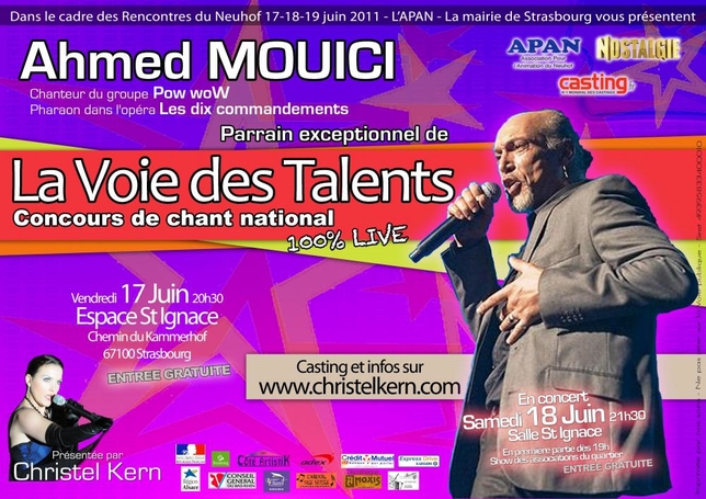 Organisé par l’APAN et Cristel Kern, la Voie des Talents qui a lieu tous les ans au mois de juin, est l’un des rare concours français en LIVE. En effet, tous les candidats, adultes ou juniors sont accompagnés par des musiciens en LIVE sur une scène digne des plus grande. Chaque année un parrain célèbre est le président du Jury. Le tout est orchestré est présenté par la chanteuse Cristel Kern.