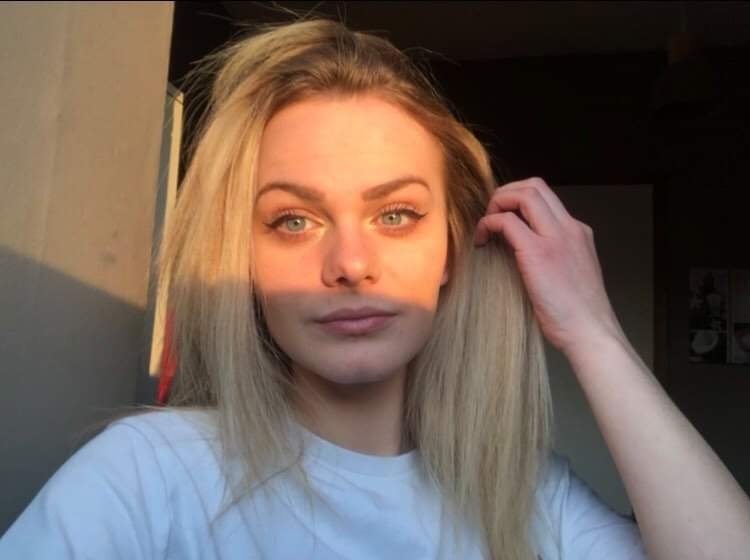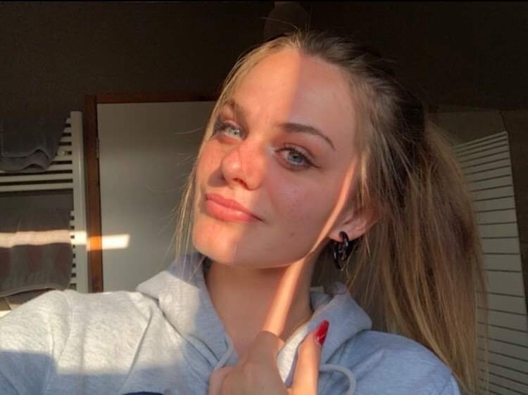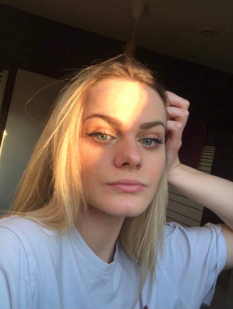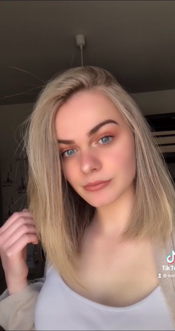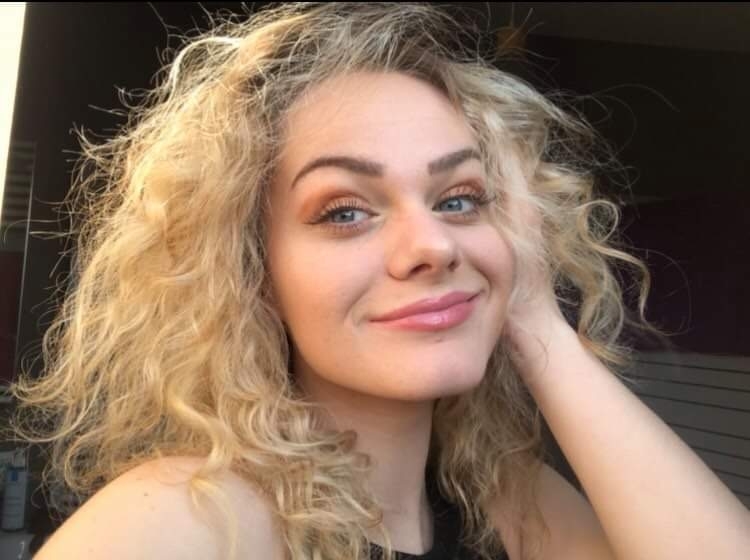 - Cheveux châtains clair mais colorés en blond, bouclés de nature mais lissés quotidiennement.
