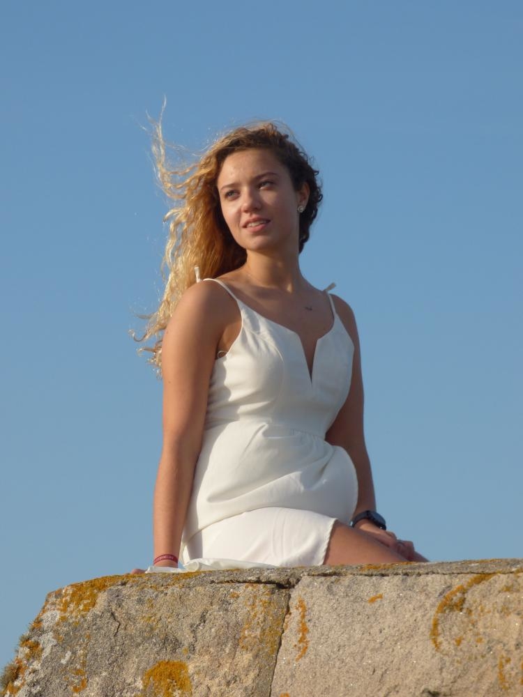 Métisse, blonde aux cheveux bouclés, yeux bleus, Silhouette de nageuse. Taille fine et musclé.