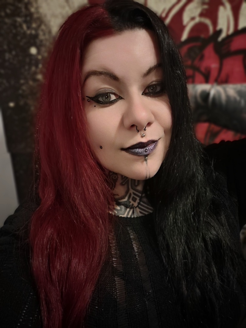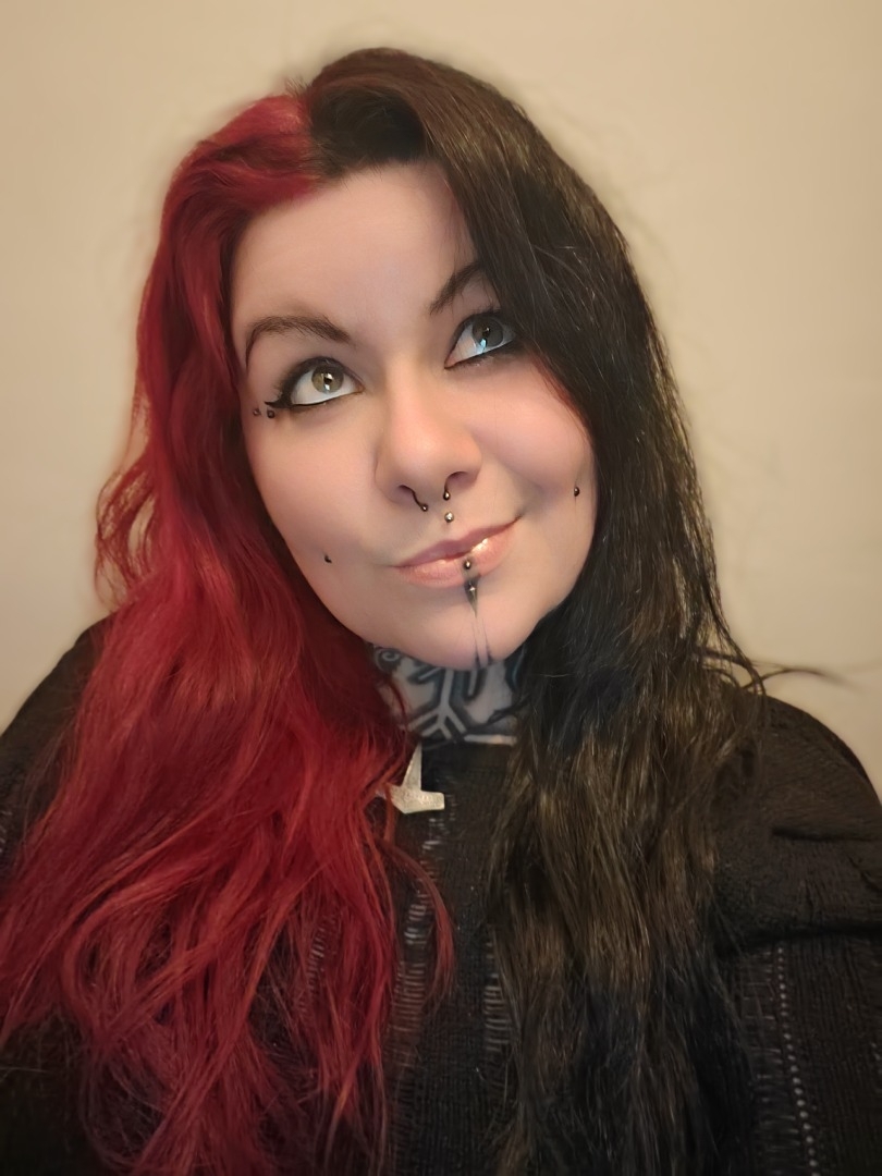Cheveux colorés moitié rouge, moitié noir.