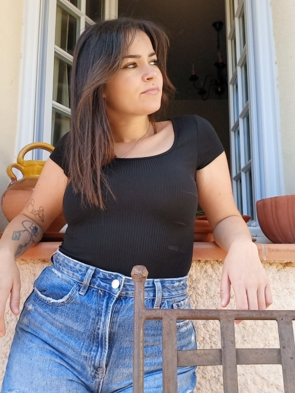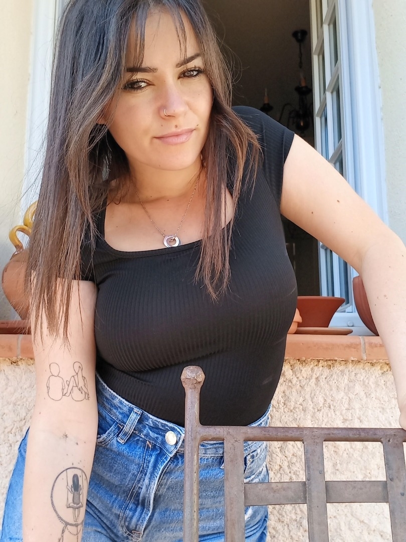 grain de beauté au dessus de la bouche, piercing à la narine gauche et tatouage sur les bras.